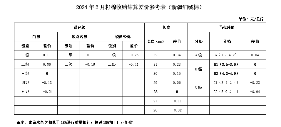 根據(jù)《中國(guó)棉花協(xié)會(huì)籽棉收購(gòu)結(jié)算差價(jià)參考表(新疆細(xì)絨棉)管理辦法》規(guī)定,現(xiàn)正式發(fā)布2024年2月《籽棉收購(gòu)結(jié)算差價(jià)參考表(新疆細(xì)絨棉)》(單位:元/公斤),為新疆地區(qū)籽棉收購(gòu)工作提供參考。
