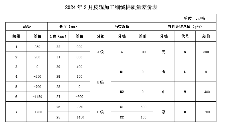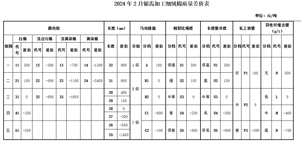 根據(jù)《中國棉花協(xié)會(huì)國產(chǎn)棉質(zhì)量差價(jià)表管理辦法》規(guī)定,現(xiàn)正式發(fā)布2024年2月《鋸齒加工細(xì)絨棉質(zhì)量差價(jià)表》、《皮輥加工細(xì)絨棉質(zhì)量差價(jià)表》和《長絨棉質(zhì)量差價(jià)表》(單位:元/噸)。