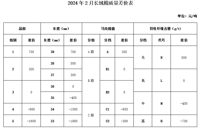 依據(jù)2024年1月的棉花公檢質(zhì)量數(shù)據(jù)、中國棉花協(xié)會(huì)棉花質(zhì)量價(jià)差自動(dòng)生成系統(tǒng)采集的棉花加工企業(yè)銷售成交價(jià)、紡織企業(yè)監(jiān)測(cè)點(diǎn)的采集數(shù)據(jù)及當(dāng)月的中國棉花價(jià)格指數(shù),并征求業(yè)內(nèi)相關(guān)專家的意見,與上月相比,2024年2月《鋸齒加工細(xì)絨棉質(zhì)量差價(jià)表》、《皮輥加工細(xì)絨棉質(zhì)量差價(jià)表》和《長絨棉質(zhì)量差價(jià)表》差價(jià)保持不變。