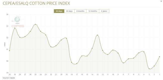 據(jù)外電1月31日消息,1月31日巴西CEPEA/ESALQ棉花價(jià)格指數(shù)報(bào)每磅80.39美分,較前一日上漲1.01%。