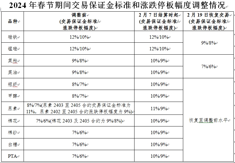 根據(jù)《鄭州商品交易所期貨交易風險控制管理辦法》第八條規(guī)定,經(jīng)研究決定,對2024年春節(jié)期間部分期貨合約交易保證金標準和漲跌停板幅度作出如下調(diào)整: