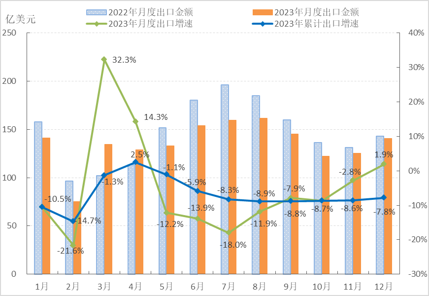 圖3 2023年1-12月我國(guó)服裝及衣著附件出口情況