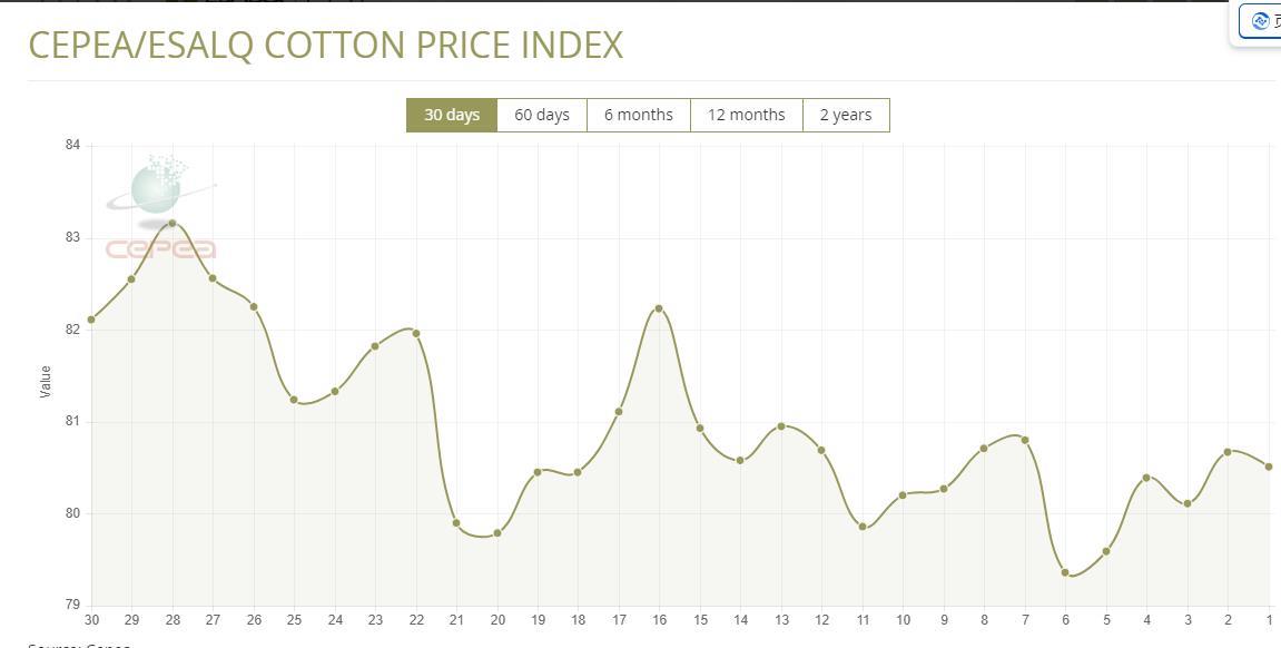 據(jù)外電2月5日消息,2月5日巴西CEPEA/ESALQ棉花價格指數(shù)報每磅80.51美分,較前一日下滑0.2%。