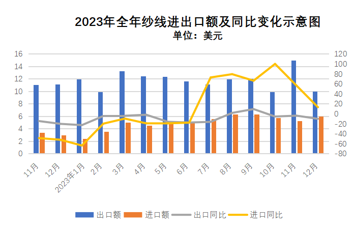 12月我國紗線出口10億美元,同比下降10.1%,較上月降幅擴大;出口44.2萬噸,同比下降9.4%。我國紗線進口5.2億美元,同比增長74.3%;進口18.9萬噸,同比增長85.7%。紗線進口拉動紡織品進口27個百分點,拉動紡織服裝進口13.9個百分點。