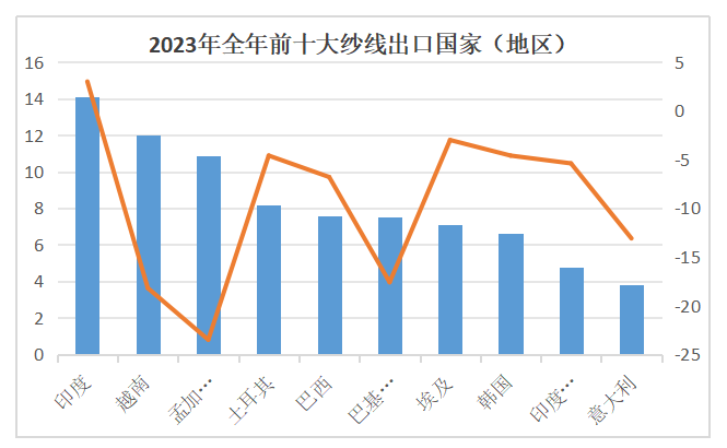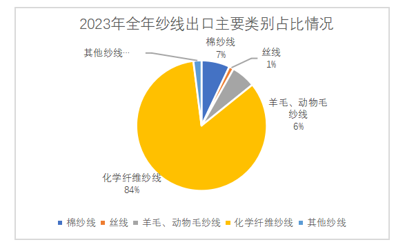 2023年我國對東盟出口紗線26.3億美元,同比下降12.9%。從商品結(jié)構(gòu)看,對東盟出口以化纖紗線為主,占比超過75%,棉紗線出口占12%。