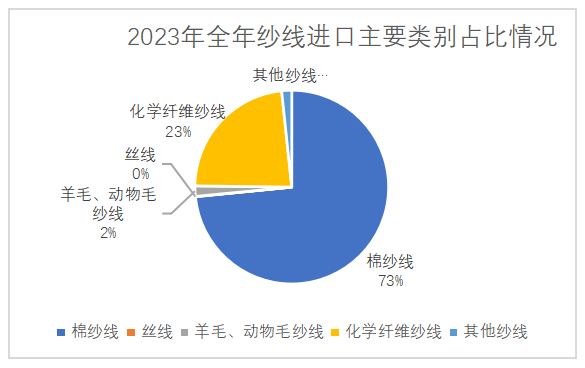 從大類產(chǎn)品看,2023年進口棉紗線43.9億美元,同比增長21.7%,進口數(shù)量168.7萬噸,同比增長43.4%;進口化纖13.8億美元,同比下降2.8%;進口絲線和羊毛、動物紗線分別為302萬美元和1.4億美元,同比增長5.7%和增長4%。我國紗線進口以棉紗線為主,占紗線進口總額的70%。