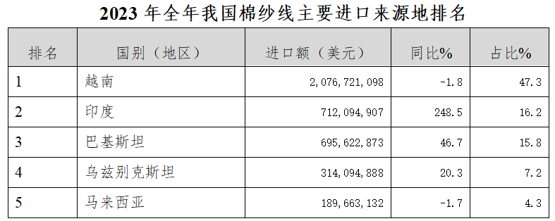 2023年我國進口紗線59.8億美元,同比上漲13.2%,進口204.3萬噸,同比增長32.6%。