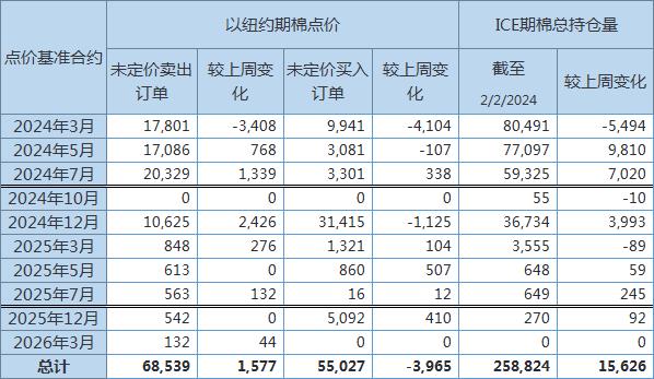 美國(guó)商品期貨交易委員會(huì)(CFTC)公布,截至2月2日,以ICE期棉2403合約點(diǎn)價(jià)未定價(jià)賣出訂單(UnfixedCallSales)較前周減少3408手至17801手。