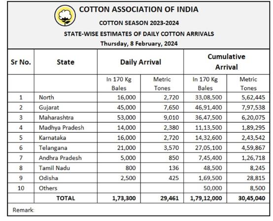 2023/24年度(2023年10月1日至次年9月)迄今,印度棉花到貨量為17912000包或3045040噸。