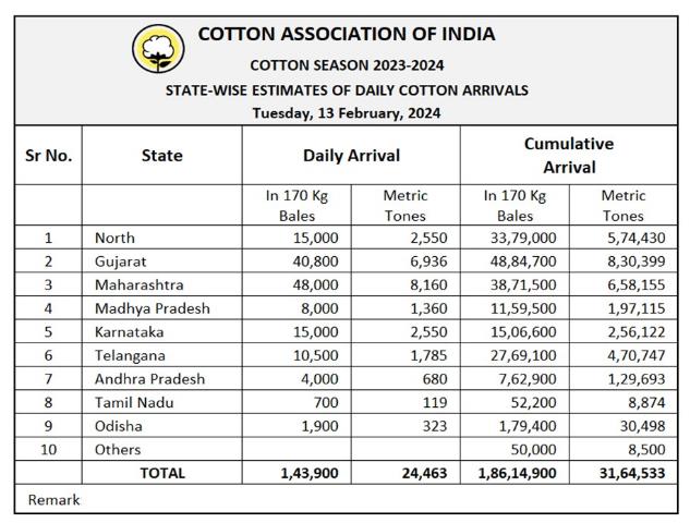 據(jù)外電2月13日消息,印度棉花協(xié)會(CAI)公布,2月13日,印度棉花到貨量估計為143900包(每包170公斤)或24463噸。