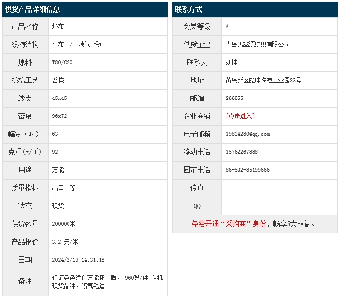 2月19日,青島鴻鑫源紡織有限公司滌棉平布T80/C20 45x45 96x72 63" 92g/㎡ 1/1 噴氣 毛邊,報(bào)價(jià)為3.20元/米,實(shí)際成交價(jià)以協(xié)商為準(zhǔn)。[點(diǎn)擊查看詳情]