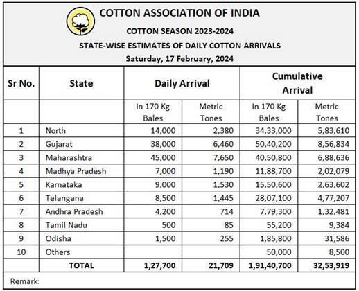 據(jù)外電2月17日消息,印度棉花協(xié)會(CAI)公布,2月17日印度棉花到貨量估計為127700包(每包170公斤)或21709噸。
