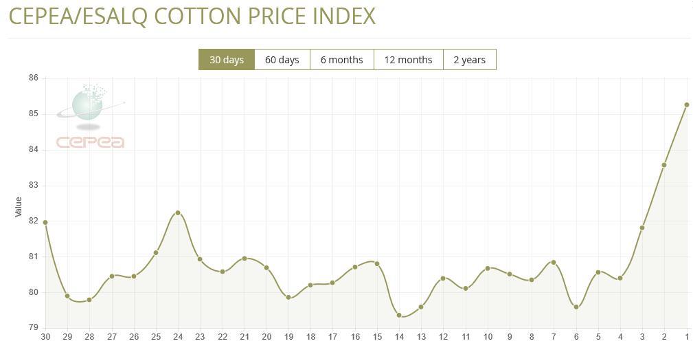 據(jù)外電2月19日消息,2月19日巴西CEPEA/ESALQ棉花價(jià)格指數(shù)報(bào)每磅85.26美分,較前一日上漲2.02%。
