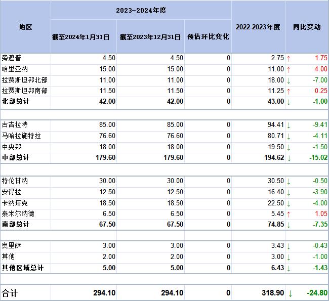 以下為印度棉花協(xié)會分區(qū)域產(chǎn)量預(yù)估:單位:十萬包(1包=170公斤)