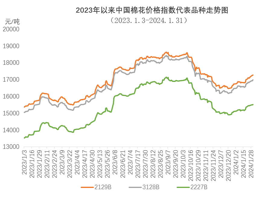 1月,中國棉花價格指數(shù)(CCIndex3128B)初期維持震蕩,月中出現(xiàn)反彈,月均價較上月上漲。月內(nèi)新疆棉收購基本結(jié)束,新棉加工進度持續(xù)放緩,紡織廠節(jié)前備貨,市場需求出現(xiàn)小幅回暖,現(xiàn)貨價格出現(xiàn)上漲。1月31日,中國棉花價格指數(shù)(CCIndex3128B)收于16995元/噸,環(huán)比上漲533元;月均價16690元/噸,環(huán)比上漲412元,同比上漲1378元。