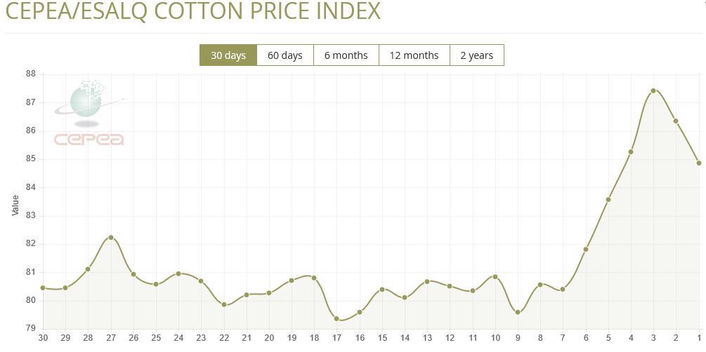 據(jù)外電2月22日消息,2月22日巴西CEPEA/ESALQ棉花價(jià)格指數(shù)報(bào)每磅84.86美分,較前一日下滑1.73%。