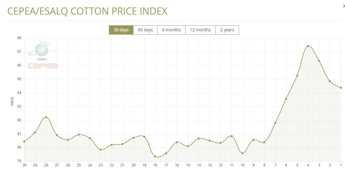據(jù)外電2月26日消息,2月23日巴西CEPEA/ESALQ棉花價(jià)格指數(shù)報(bào)每磅84.38美分,較前一日下滑0.57%。