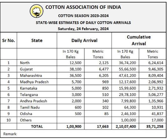 2023/24年度(2023年10月1日至次年9月)迄今,印度棉花到貨量為21007400包或3571258噸。