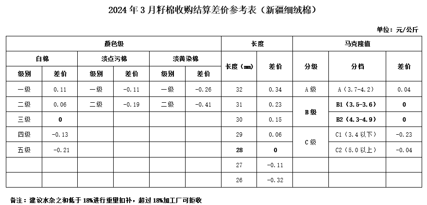 依據(jù)中國棉花協(xié)會發(fā)布的2024年3月《鋸齒加工細(xì)絨棉質(zhì)量差價表》和中國棉花預(yù)警系統(tǒng)2023年9月-2024年1月新疆籽棉收購平均衣分率數(shù)據(jù),折算得出籽棉收購差價,現(xiàn)正式發(fā)布2024年3月《籽棉收購結(jié)算差價參考表(新疆細(xì)絨棉)》(單位:元/公斤),為新疆地區(qū)籽棉收購工作提供參考。