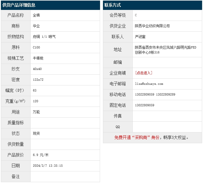 3月7日,陜西華業(yè)紡織有限公司純棉府綢BJC100 40x40 133x72 63" 120g/㎡ 1/1 噴氣,報(bào)價(jià)為6.9元/米,實(shí)際成交價(jià)以協(xié)商為準(zhǔn)。[點(diǎn)擊查看詳情]