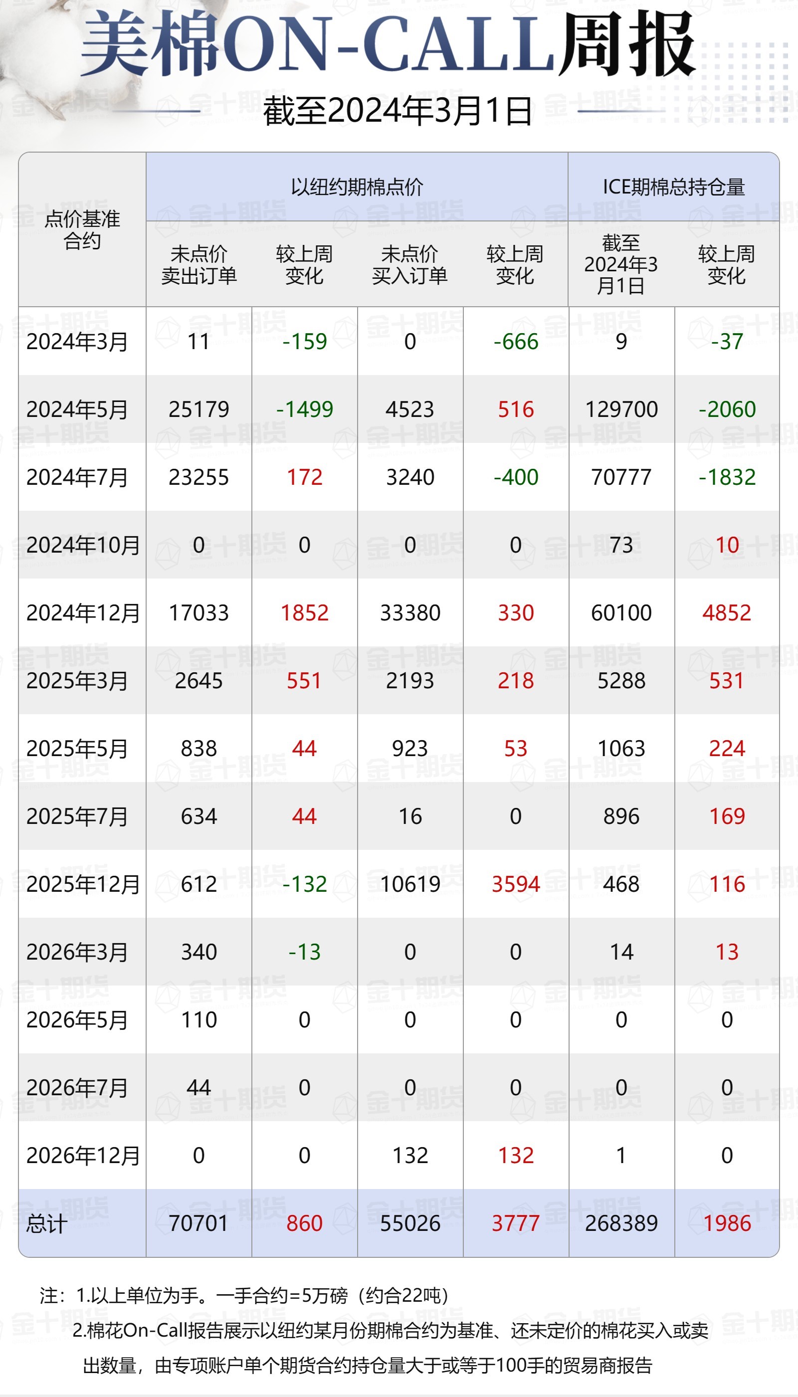 據(jù)美國(guó)商品期貨交易委員會(huì)(CFTC)最新數(shù)據(jù),截至3月1日,①美棉On-Call未點(diǎn)價(jià)賣出訂單70701手,環(huán)比增加860手;未點(diǎn)價(jià)買入訂單55026手,環(huán)比增加3777手;②ICE期棉2403合約上賣方未點(diǎn)價(jià)合約為11手,較此前一周減少159手;③ICE期棉2405合約上賣方未點(diǎn)價(jià)合約為25179手,較此前一周減少1499手;④ICE期棉2407合約上賣方未點(diǎn)價(jià)合約為23255手,較此前一周增加172手;⑤ICE棉花期貨盤面2023/24年度(8月至次年7月)的On-Call合約未點(diǎn)價(jià)賣出訂單為48445手,環(huán)比減少1486手。