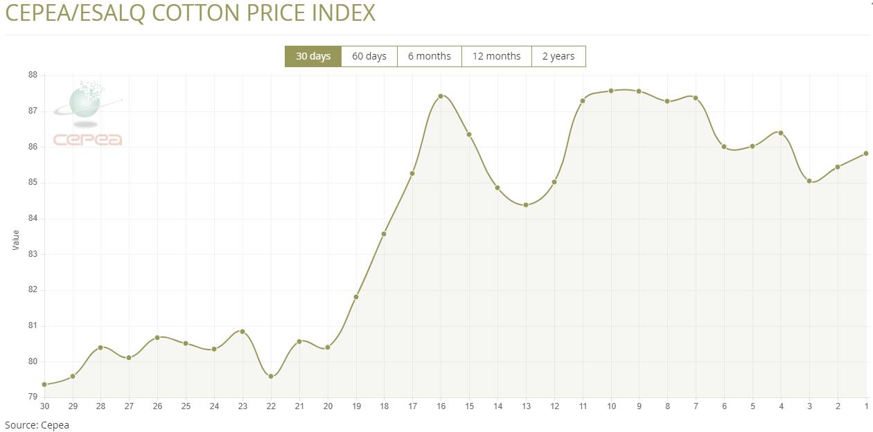 據(jù)外電3月12日消息,3月12日巴西CEPEA/ESALQ棉花價(jià)格指數(shù)報(bào)每磅85.82美分,較前一日上漲0.44%。