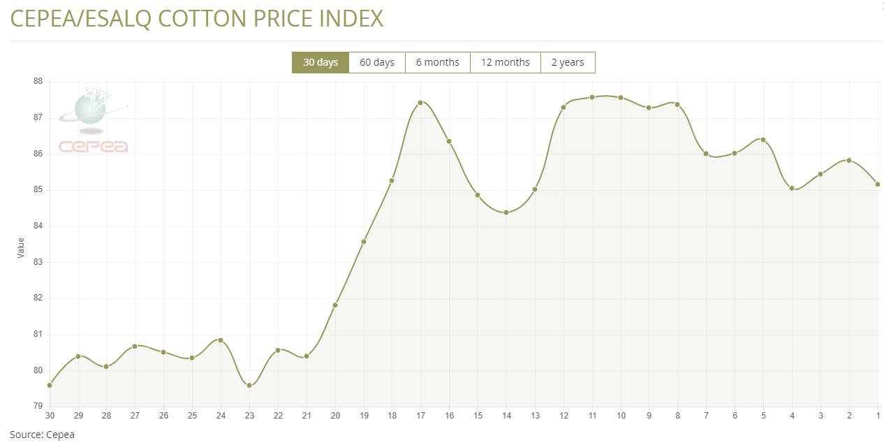 據(jù)外電3月13日消息,3月13日巴西CEPEA/ESALQ棉花價(jià)格指數(shù)報(bào)每磅85.16美分,較前一日下跌0.77%。