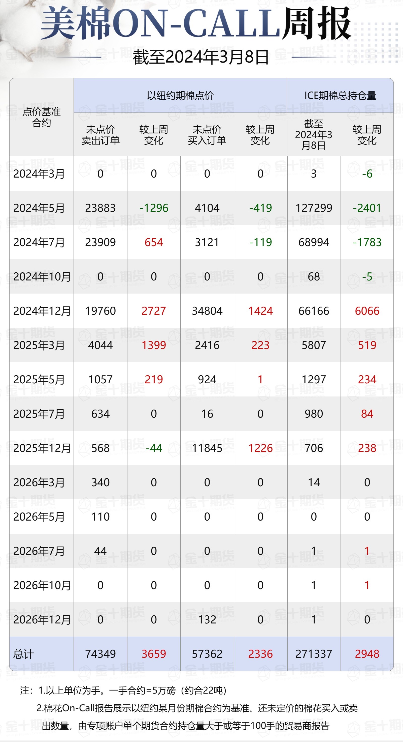 據美國商品期貨交易委員會(CFTC)最新數據,截至3月8日,①美棉On-Call未點價賣出訂單74349手,環(huán)比增加3659手;未點價買入訂單57362手,環(huán)比增加2336手;②ICE期棉2403合約上賣方未點價合約為0手,較此前一周增加0手;③ICE期棉2405合約上賣方未點價合約為23883手,較此前一周減少1296手;④ICE期棉2407合約上賣方未點價合約為23909手,較此前一周增加654手;⑤ICE棉花期貨盤面2023/24年度(8月至次年7月)的On-Call合約未點價賣出訂單為47792手,環(huán)比減少642手。