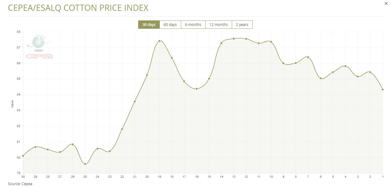 據(jù)外電3月15日消息,3月15日巴西CEPEA/ESALQ棉花價格指數(shù)報每磅84.33美分,較前一日下滑1.3%。