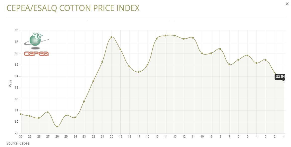 據(jù)外電3月18日消息,3月18日巴西CEPEA/ESALQ棉花價(jià)格指數(shù)報(bào)每磅83.54美分,較前一日下滑0.94%。