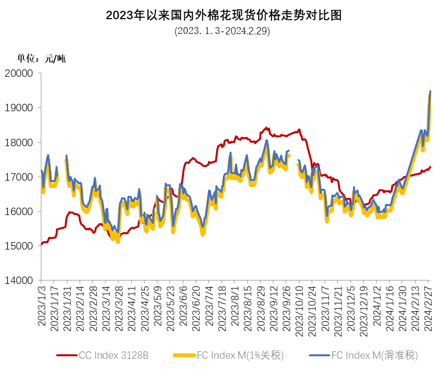 2月,受外圍股市、能源市場走高的帶動,加上USDA報告調(diào)減2023/24年度全球棉花產(chǎn)量,調(diào)增消費量,推動棉價持續(xù)上漲,ICE期棉主力合約突破100美分/磅,最高漲至103.8美分/磅,月末因美棉簽約數(shù)據(jù)表現(xiàn)不佳,ICE期棉主力合約回落至100美分/磅以下。ICE期棉主力合約2月均結(jié)算價92.61美分/磅,環(huán)比上漲10.04美分,漲幅12.2%。中國進口棉價格指數(shù)FCIndexM月均101.82美分/磅,環(huán)比上漲8.92美分;月底為110.97美分/磅,環(huán)比上漲15.7美分,1%關(guān)稅下折人民幣19368元/噸,高于同期中國棉花價格指數(shù)(CCIndex3128B)2073元。