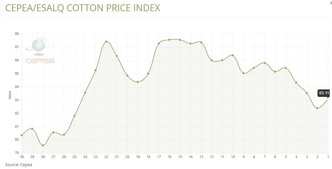 據(jù)外電3月20日消息,3月20日巴西CEPEA/ESALQ棉花價(jià)格指數(shù)報(bào)每磅83.11美分,較前一日上漲0.86%。