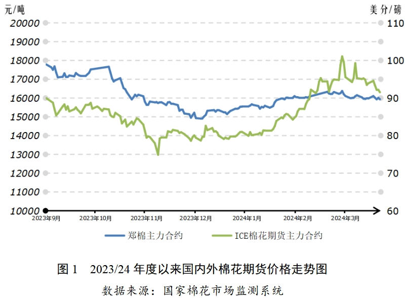 2023/24年度國際棉花供需充裕狀況有所收緊,終端服裝市場去庫仍較緩慢。2月底以來ICE期價大漲后回調(diào),暫時處盤整狀態(tài)。