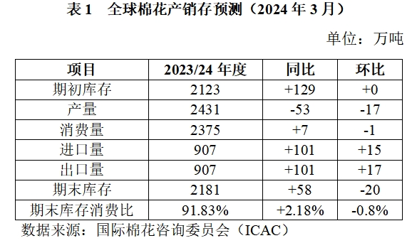 3月,據(jù)國際棉花咨詢委員會(ICAC)預(yù)測,2023/24年度全球棉花產(chǎn)量2431萬噸,環(huán)比調(diào)減17萬噸;棉花消費(fèi)量2375萬噸,環(huán)比調(diào)減1萬噸;期末庫存2181萬噸,環(huán)比調(diào)減20萬噸;棉花庫存消費(fèi)比91.83%,環(huán)比調(diào)減0.8個百分點(diǎn)。其中調(diào)增中國消費(fèi)量30萬噸、進(jìn)口量25萬噸,調(diào)增巴西、美國出口量21萬噸、4萬噸。