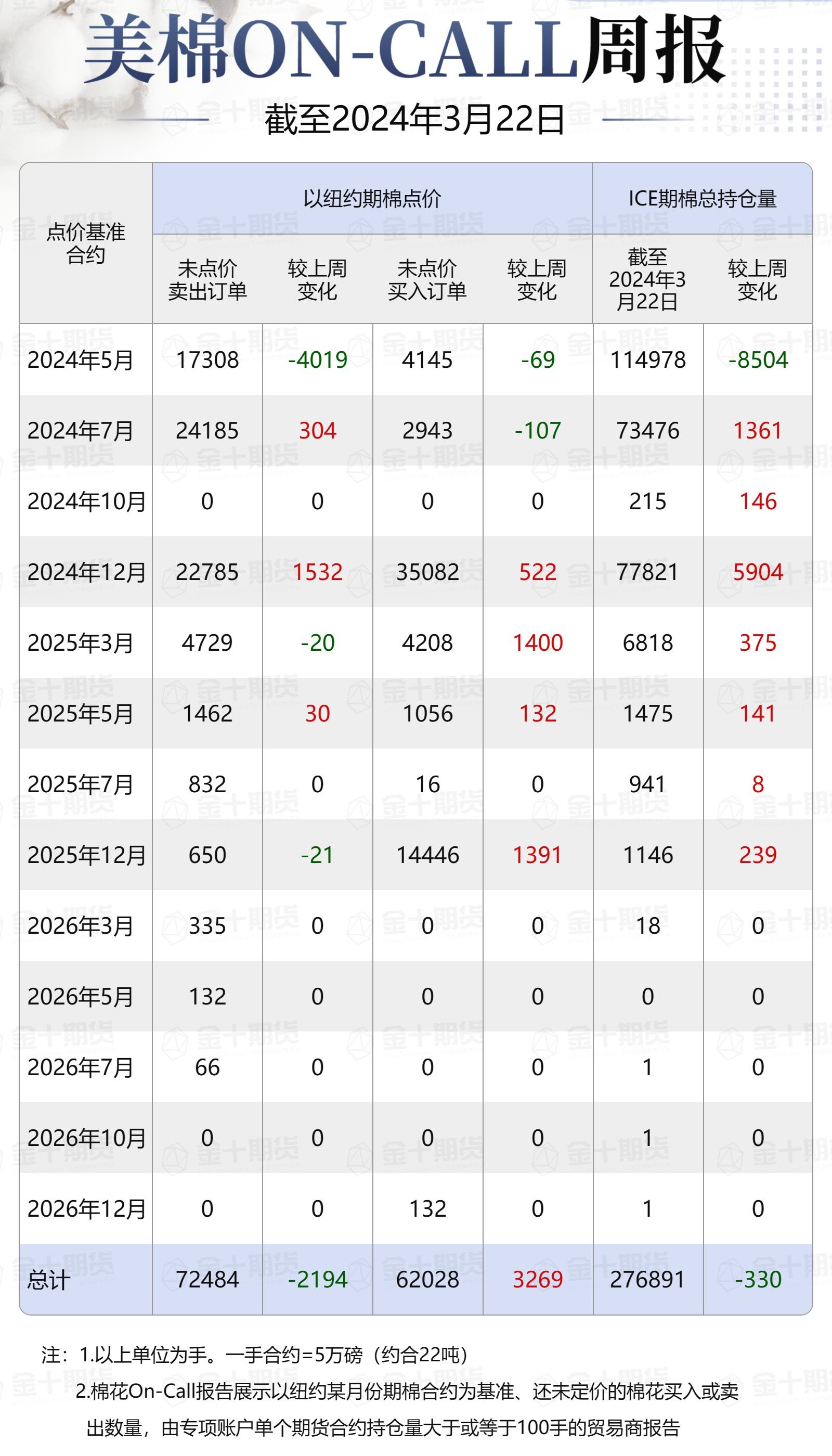 據(jù)美國商品期貨交易委員會(huì)(CFTC)最新數(shù)據(jù),截至3月22日,①美棉On-Call未點(diǎn)價(jià)賣出訂單72484手,環(huán)比減少2194手;未點(diǎn)價(jià)買入訂單62028手,環(huán)比增加3269手;②ICE期棉2405合約上賣方未點(diǎn)價(jià)合約為17308手,較此前一周減少4019手;③ICE期棉2407合約上賣方未點(diǎn)價(jià)合約為24185手,較此前一周增加304手;④ICE棉花期貨盤面2023/24年度(8月至次年7月)的On-Call合約未點(diǎn)價(jià)賣出訂單為41493手,環(huán)比減少3715手。