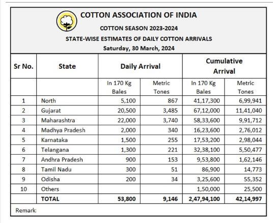 2023/24年度(2023年10月1日至次年9月)迄今,印度棉花到貨量為24794100包或4214997噸。