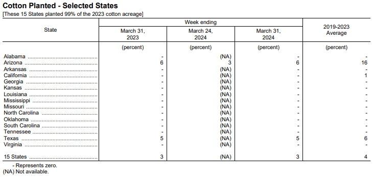 據(jù)美國農(nóng)業(yè)部網(wǎng)站4月1日消息,美國農(nóng)業(yè)部(USDA)在每周作物生長報(bào)告中公布稱,截至2024年3月31日當(dāng)周,美棉種植率為3%,去年同期為3%,五年均值為4%。