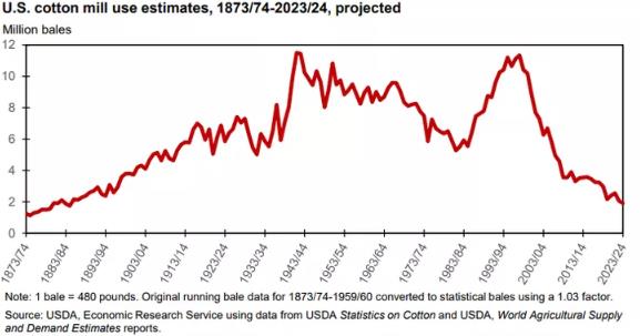 美國農(nóng)業(yè)部下屬農(nóng)業(yè)經(jīng)濟(jì)研究局報告稱,“在2023/24年度(8月至7月)美國棉紡廠使用量(原棉加工成紡織品的數(shù)量)預(yù)計為190萬包,創(chuàng)逾一百年來最低水平。前低為1884/85年度,棉花使用量約170萬包?!?/p>