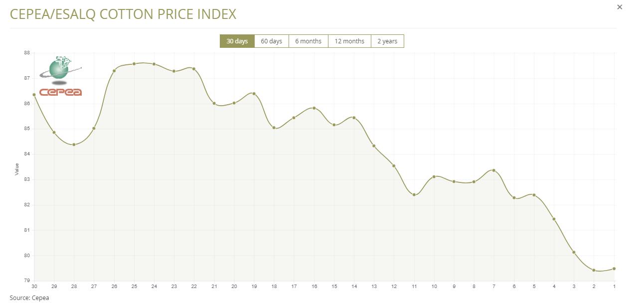 據(jù)外電4月3日消息,4月3日巴西CEPEA/ESALQ棉花價(jià)格指數(shù)報(bào)每磅79.48美分,較前一日上漲0.08%。