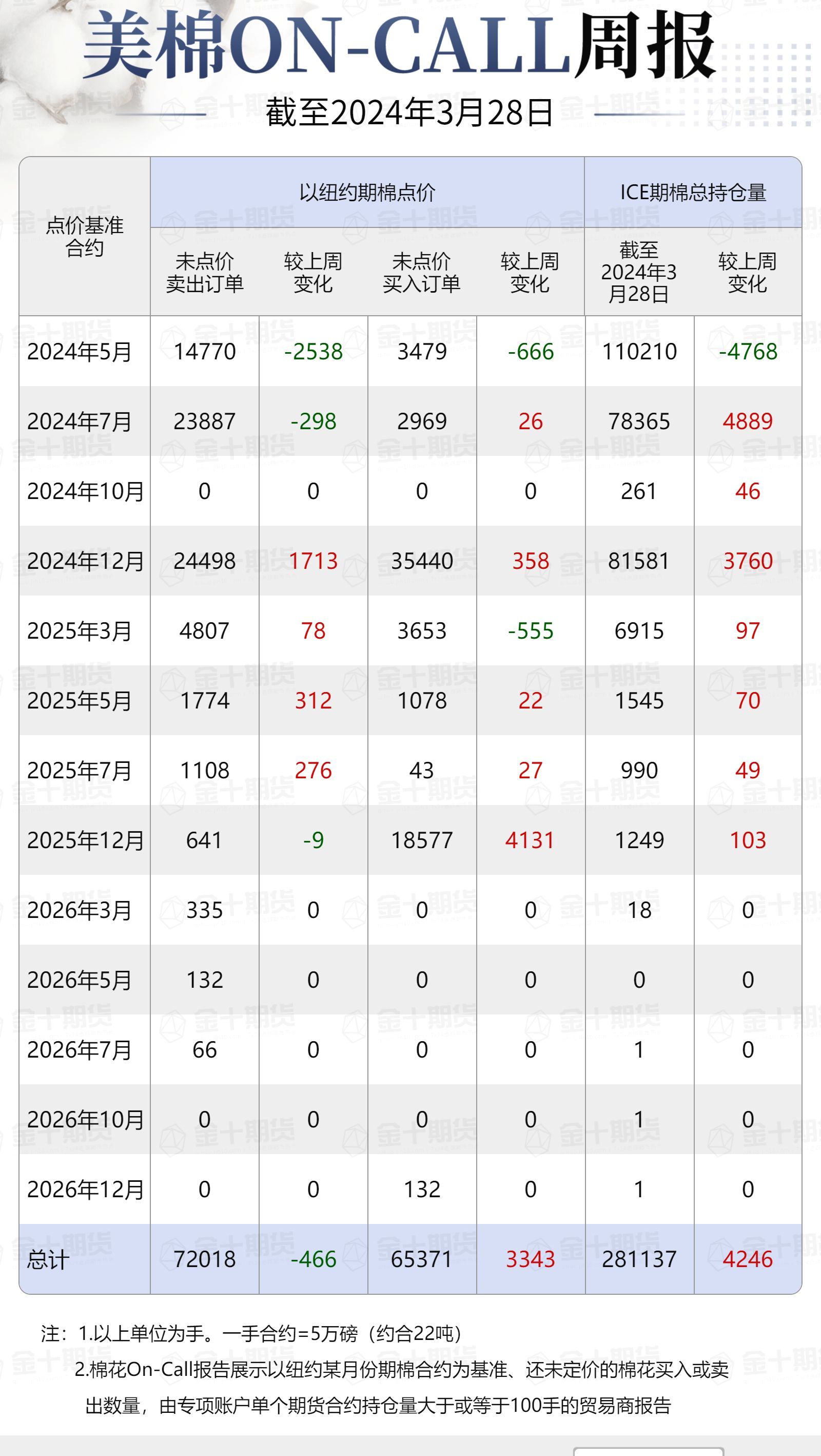 據(jù)美國商品期貨交易委員會(CFTC)最新數(shù)據(jù),截至3月28日,①美棉On-Call未點價賣出訂單72018手,環(huán)比減少466手;未點價買入訂單65371手,環(huán)比增加3343手;②ICE期棉2405合約上賣方未點價合約為14770手,較此前一周減少2538手;③ICE期棉2407合約上賣方未點價合約為23887手,較此前一周減少298手;④ICE棉花期貨盤面2023/24年度(8月至次年7月)的On-Call合約未點價賣出訂單為38657手,環(huán)比減少2836手。