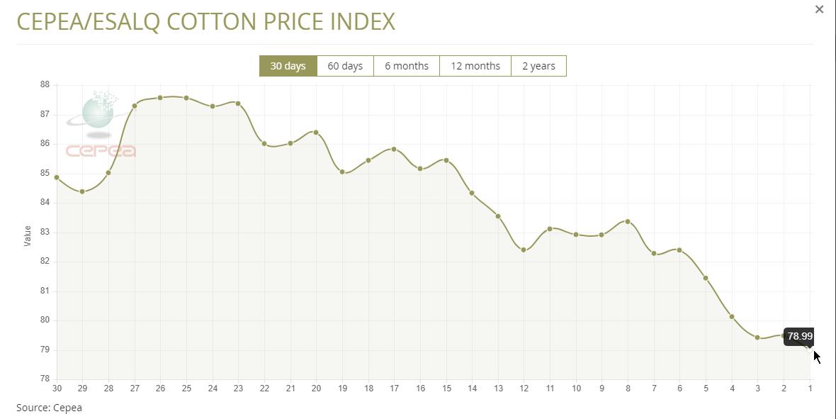 據(jù)外電4月4日消息,4月4日巴西CEPEA/ESALQ棉花價(jià)格指數(shù)報(bào)每磅78.99美分,較前一日下跌0.62%。