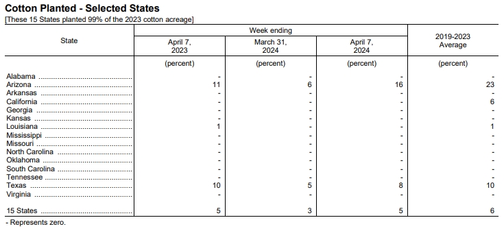 據(jù)美國農(nóng)業(yè)部網(wǎng)站4月8日消息,美國農(nóng)業(yè)部(USDA)在每周作物生長報告中公布稱,截至2024年4月7日當(dāng)周,美棉種植率為5%,前周為3%,去年同期為5%,五年均值為6%。