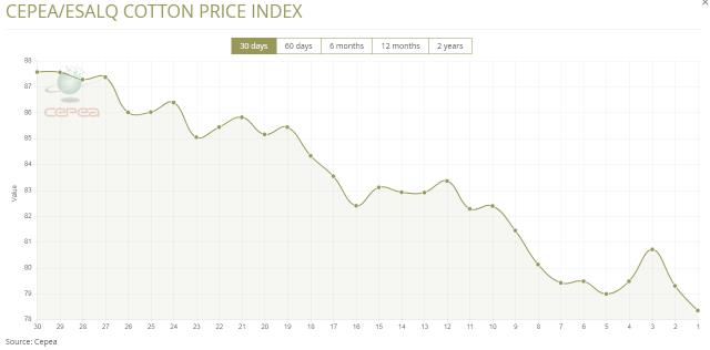 據(jù)外電4月10日消息,4月10日巴西CEPEA/ESALQ棉花價(jià)格指數(shù)報(bào)每磅78.35美分,較前一日下跌1.2%。