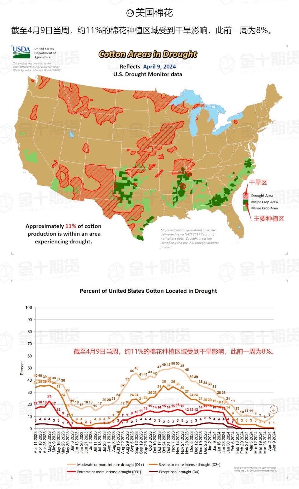 據(jù)USDA農(nóng)作物干旱報告:截至4月9日當(dāng)周,約11%美棉種植區(qū)域受到干旱影響,此前周為8%。