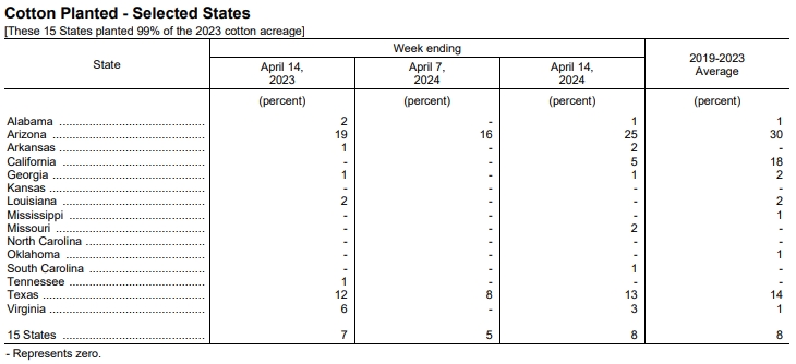 據(jù)美國農(nóng)業(yè)部網(wǎng)站4月15日消息,美國農(nóng)業(yè)部(USDA)在每周作物生長報(bào)告中公布稱,截至2024年4月14日當(dāng)周,美國棉花種植率為8%,前周為5%,去年同期為7%,五年均值為8%。