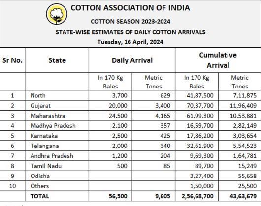 據(jù)外電4月16日消息,印度棉花協(xié)會(CAI)公布,4月16日印度棉花到貨量預(yù)估為56500包(每包170公斤)或9605噸。