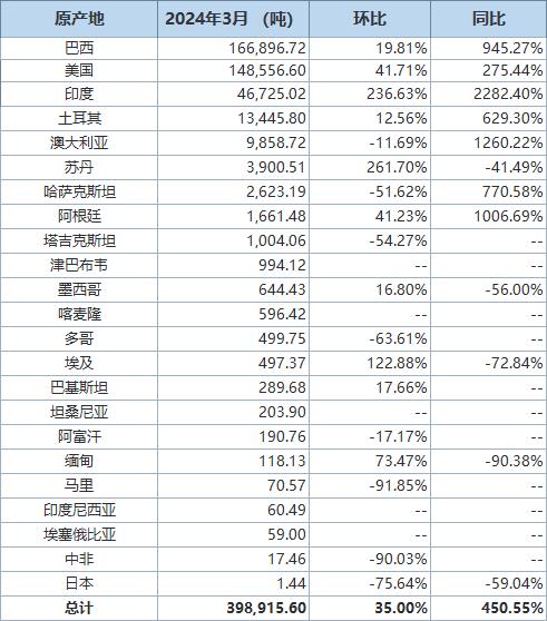 據(jù)海關(guān)統(tǒng)計數(shù)據(jù),2024年3月我國進口棉花約40萬噸,環(huán)比增加約10萬噸,同比增長約450.6%。