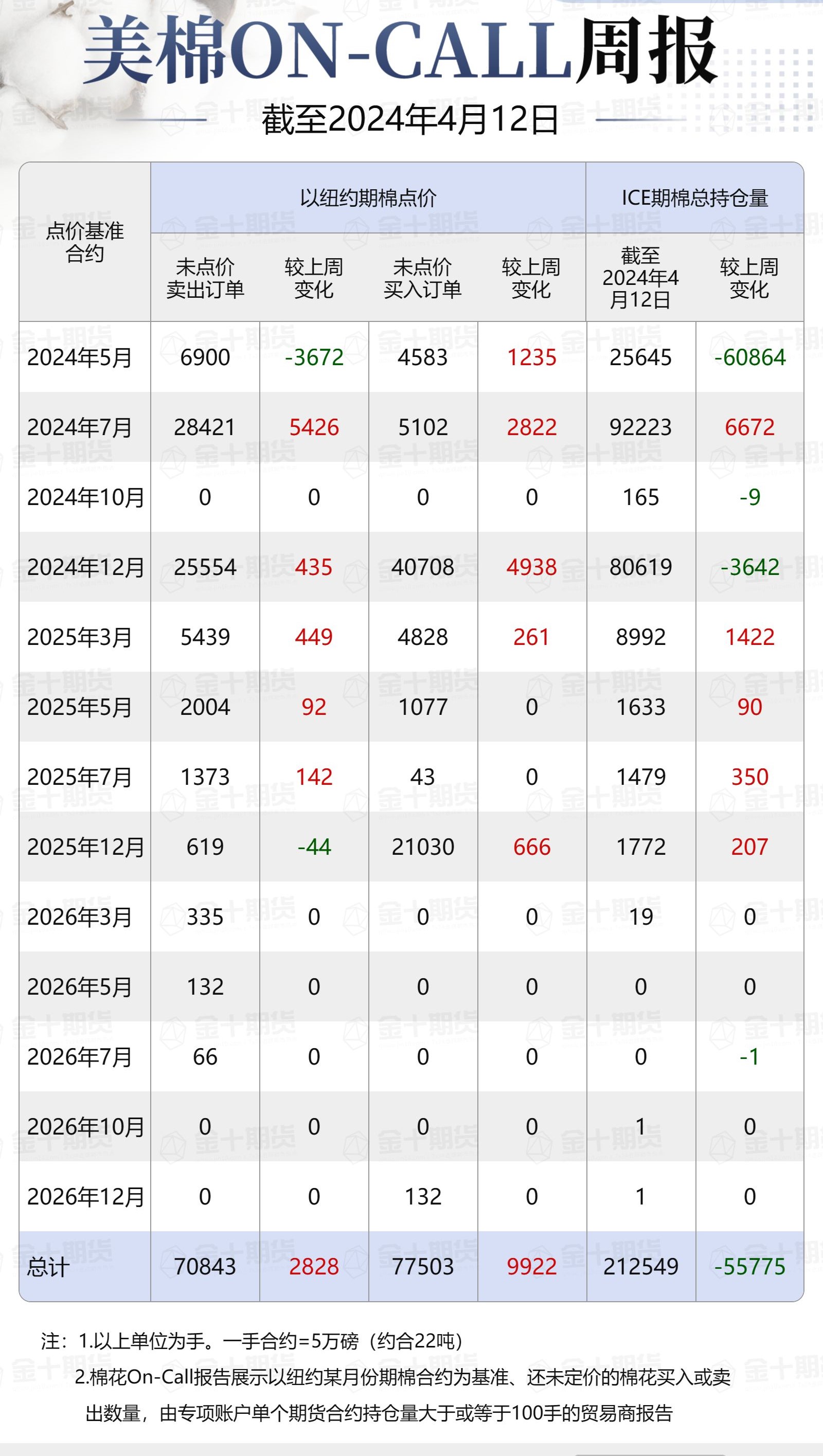 據(jù)美國(guó)商品期貨交易委員會(huì)(CFTC)最新數(shù)據(jù),截至4月12日,①美棉On-Call未點(diǎn)價(jià)賣(mài)出訂單70843手,環(huán)比增加2828手;未點(diǎn)價(jià)買(mǎi)入訂單77503手,環(huán)比增加9922手;②ICE期棉2405合約上賣(mài)方未點(diǎn)價(jià)合約為6900手,較此前一周減少3672手;③ICE期棉2407合約上賣(mài)方未點(diǎn)價(jià)合約為28421手,較此前一周增加5426手;④ICE棉花期貨盤(pán)面2023/24年度(8月至次年7月)的On-Call合約未點(diǎn)價(jià)賣(mài)出訂單為35321手,環(huán)比增加1754手。