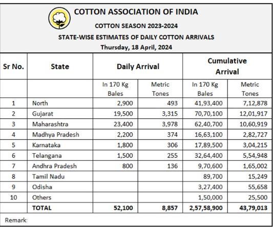 2023/24年度(10月至次年9月)迄今,印度棉花到貨量為25758900包或4379013噸。