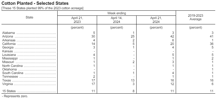 據(jù)美國農(nóng)業(yè)部網(wǎng)站4月22日消息,美國農(nóng)業(yè)部(USDA)在每周作物生長報告中公布稱,截至2024年4月21日當(dāng)周,美國棉花種植率為11%,前周為8%,去年同期為11%,五年均值為11%。
